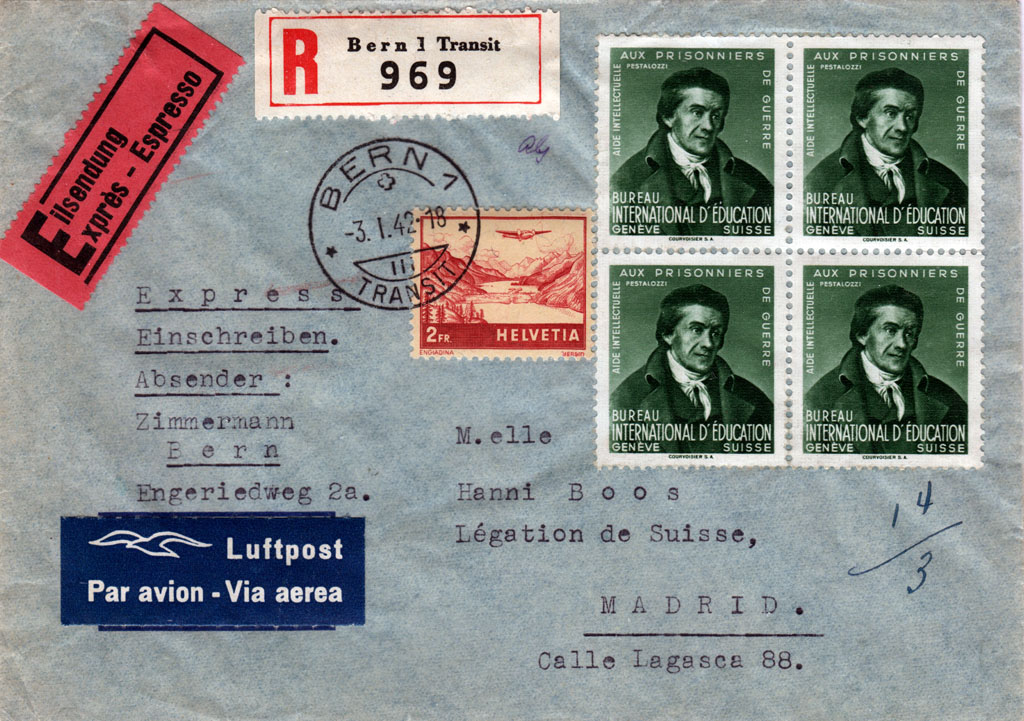 Cost of expedited shipping was 60 rappen, air mail to Spain was 10 rappen for each beginning 20 grams of weight, letter rate abroad was 30 and the cost of registering 30 rappen. The 2 francs postage stamp (Michel 393) exceeds the correct rate. The cover also has a block of four cinderella stamps (Michel BIE III) of the International Bureau of Education (nowadays under the jurisdiction of UNESCO). These stamps were used during the World War II when the bureau sent official mail concerning prisoners of war. These were normally not cancelled and so is the case here as well. The back of the cover has an arrival stamping 7.1.1942 so even if this letter was expedited, the war time route was not very fast having a delivery time exceeding four days.