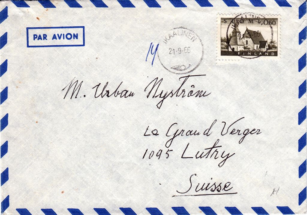 Air mail letter from Ikaalinen (Finland) to Lutry (Switzerland) dated 21.9.1966.