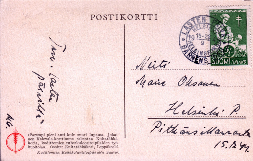 Below is a postcard of the 1946 event. Again, the cachet was not officially sanctioned by Finnish postal services. There is no evidence that the postcard was actually circulated or whether it was just cancelled for philatelic purposes.