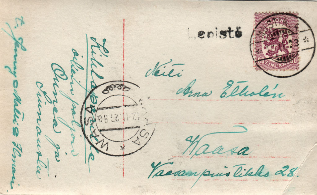 The area received it's mail stop in 1.10.1908 and even a post office in 1.10.1949. All postal functions were shut down in 1.6.1985. Nowadays post is handled by the nearby village of Porras. The below postcard was sent from Lepistö to Vaasa in 10.2.1923 and has the mail stop's cancellation. The postcard was further processed in the town of Mustiala north of Tammela.