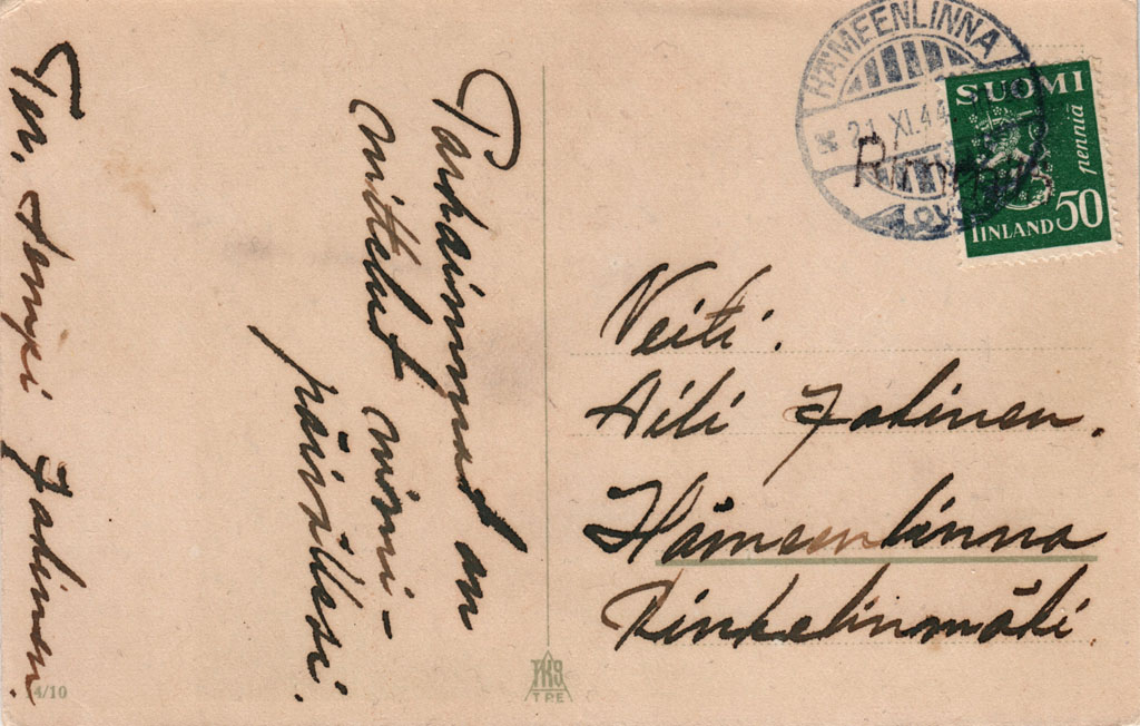 The postcard below was sent from Rimmilä to Hämeenlinna 21.11.1944.It's a simple greeting card having a Rimmilä mail stop cancellation and was naturally processed in the nearby city of Hämeenlinna. The postcard was sent - according to these rules - as a printed matter so the attached stamp of 50 pennies is a correct rate.