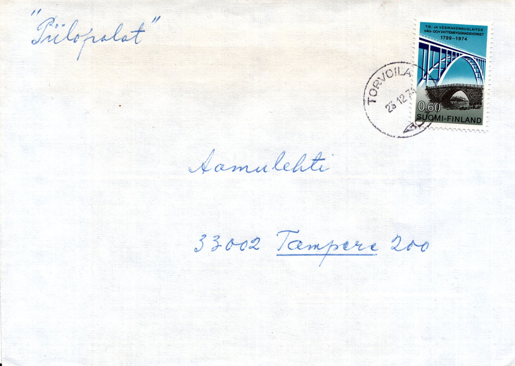 Below is a regular letter from Torvoila to Tampere (in Pirkanmaa) dated 23.12.1974.