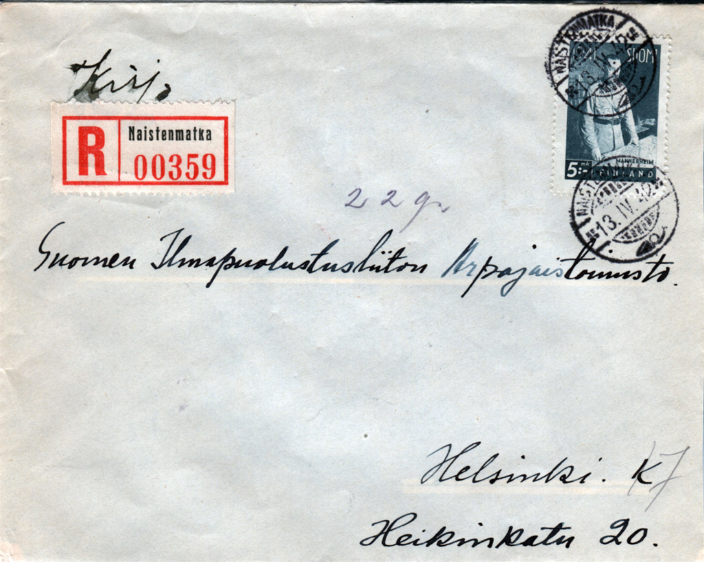Below is a registered letter from Naistenmatka to Helsinki dated 13.4.1942. The domestic letter rate (lowest weight class) was 2,75 marks between 1.4.1942 - 31.8.1942. The cost of registration was 2 marks between 1.12.1931 and 31.8.1942. Thus the franking is 0,25 marks above rate. However, the letter has a hand-written note notifying the letter weighted 22 grams. Letter rate for letters weighing between 21 and 250 grams would have been 5 marks but then the registration would have not been paid at all. Impossible to know why this letter was accepted.
