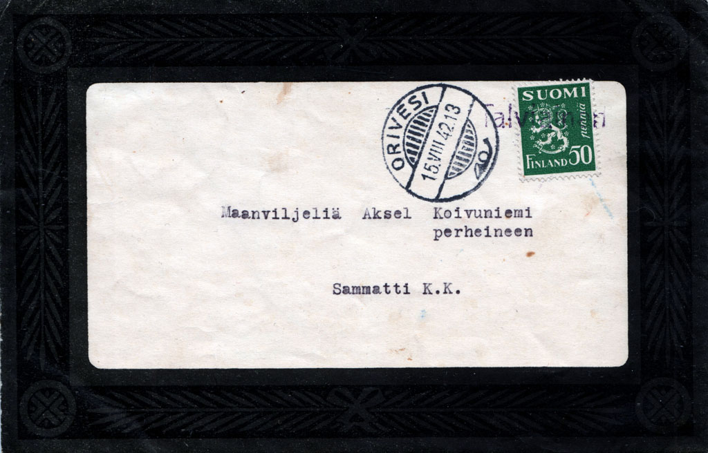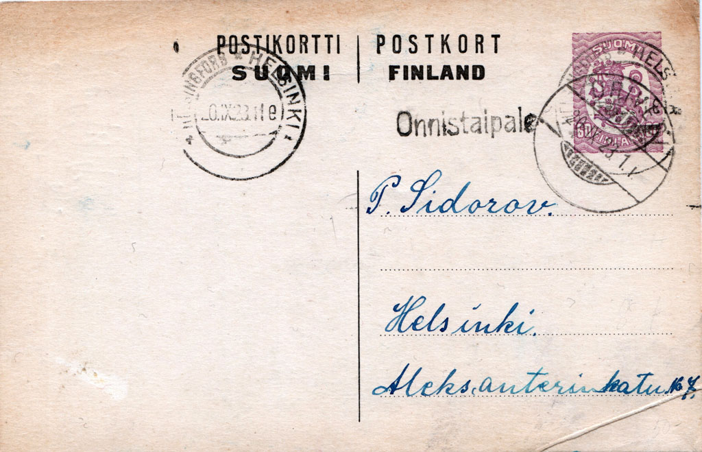 Onnistaipale received it's mail stop in 1.1.1908 but it was changed to a different name Enokunta in 1.11.1919. However, another mail stop, formerly known as Uotila, changed it's name to Onnistaipale on the same day. The mail stop was discontinued in 1.10.1970. The below postal stationery card bears the Onnistaipale mail stop stamping and was further processed in Orivesi city. It arrived to Helsinki during the same day.