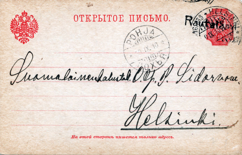 Below: Postal stationery card Rautajärvi -> Helsinki 10.9.1910. Mail stop stamping. The card was processed in the small town Pohja north of Rautajärvi and probably was routed to Helsinki via Tampere. The stationery card (Eagle model 1901) is from the 1908 print run which is revealed by extremely small differences in the printing.
