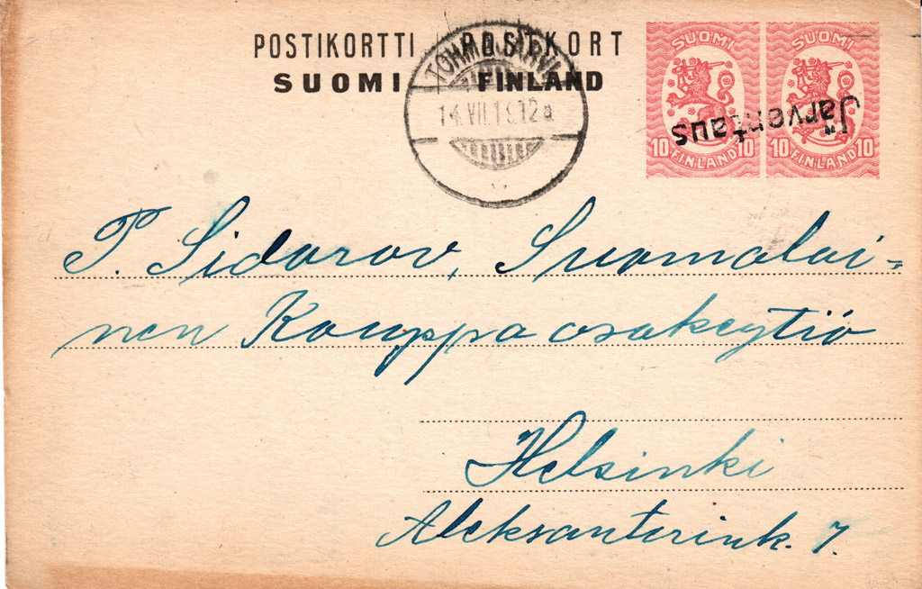 Below is a postal stationery card from Järventaus to Helsinki 14.7.1919. The postal stationery card has a "Järventaus" mail stop cancellation. The card was then forwarded to a nearby bigger habitation centre of Tohmajärvi north of the Tohmajärvi lake but still only about 10 kilometres away even when driving around the lake.