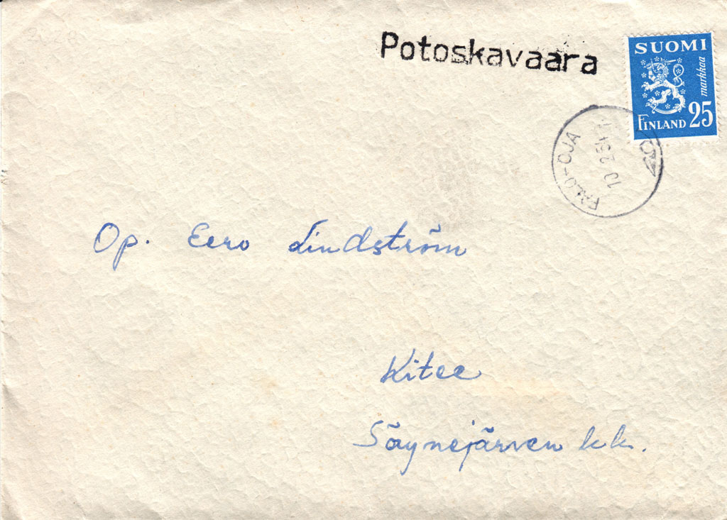 Mail stop established in 1.1.1936. Post office in 1.4.1961. Postal functions ended in 1.1.1984. During those decades postal functions operated from a single local shop at Ruunamäki ridge up until the shop was closed in 1984. The below cover that was sent 10.2.1954 from Potoskavaara to Kitee has a nice and clear mail stop cancellation of Potoskavaara. The letter was further processed in the bigger village of Palo-Oja about two kilometres to the south along the same road.