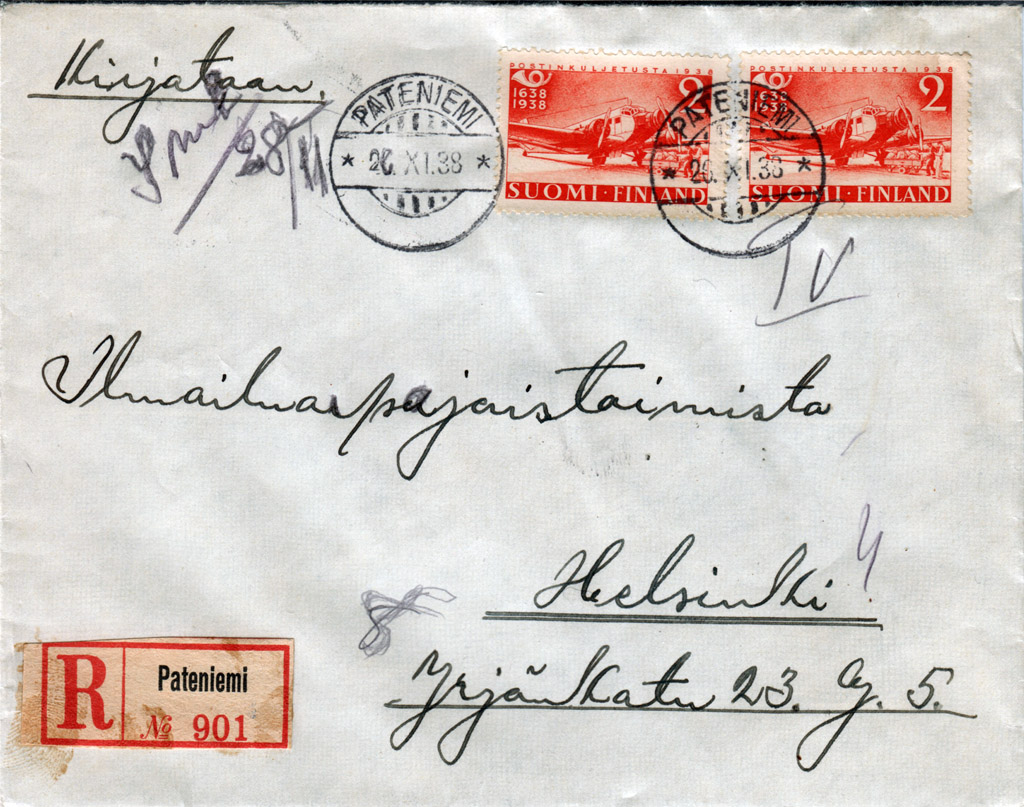 Today it is called home by over 4000 inhabitants but in the 1930's (the time the letter below was sent) there was probably around 100 households - mostly employees of the mill. The area received it's mail stop in 1.12.1910 and it's own post office in 1.6.1914. As the area grew next to Oulu city, the cancellation was changed to a simple and boring Oulu 80 in 1.1.1971. Below is a registered letter from Pateniemi to Helsinki 26.11.1938. The stamps (2 marks + 2 marks) conveniently cover the letter rate (2 marks) and registration fee (2 marks).